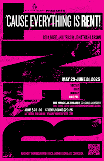 We've just begun rehearsals for Rent, and I could not be more delighted. Our cast is terrific.I saw the show on Broadway in 1997 with the entire original cast; then I researched and wrote about the show for my 2001 book Rebels with Applause: Broadway's Groundbreaking Musicals. I saw the off Broadway revival in 2011; then I directed the show myself in 2014; and while we worked on it, I wrote even more about it here in my blog (see links below).