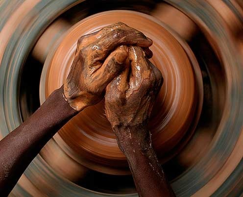 As the wheel turns, the potter uses her hands and the centrifugal force of the circling wheel to shape, extend and thin the block of clay into any manner of shapes such as plates, vases, or bowls. Once the item is finished, it is glazed, decorated, and fired in a kiln .