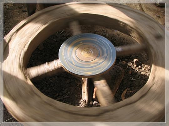 The technique of throwing pots on pottery wheels soon spread throughout the known world. Pictures of stone and wood pottery wheels have been found on Egyptian tombs dating back to 3000 B.C. The earliest pottery wheels were simple pedestals with a revolving wheel at the top that served as the worktable, and was propelled by the potter pushing the wheel around by hand as she worked. Second generation pottery wheels included a stationary working surface at the top of a pedestal, with a wheel at the base driving the working surface by kicking the wheel with the foot.