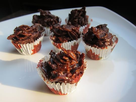 … you’ll see that it looks rather different from my picture above. That’s because when I tried to fashion my melty chocolatey cornflakes into a flat pie, it resembled, well, something rather unappetizing. So, into little decorative cups my cornflake mix went instead.