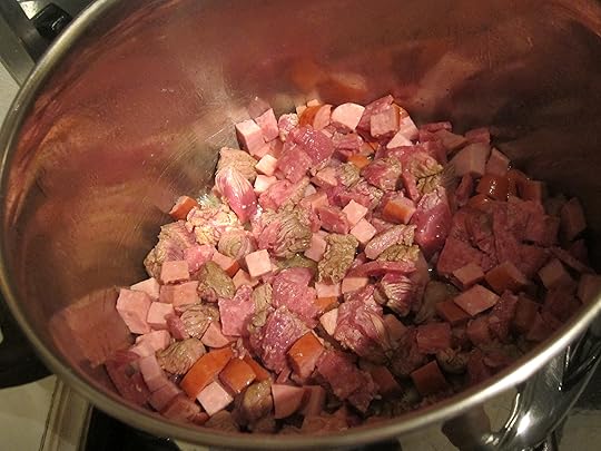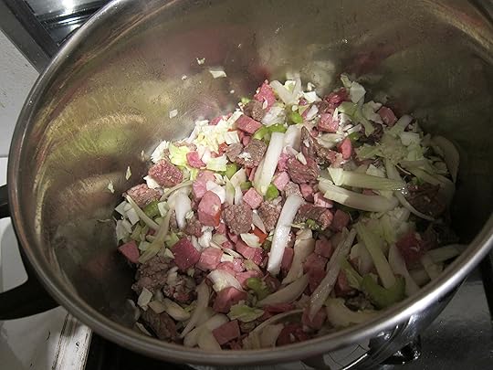 1. Cut beef, kielbasa, ham, and salami into ¼” pieces; set aside. Place peppercorns, allspice, and bay on a piece of cheesecloth and tie into a tight package; set aside.