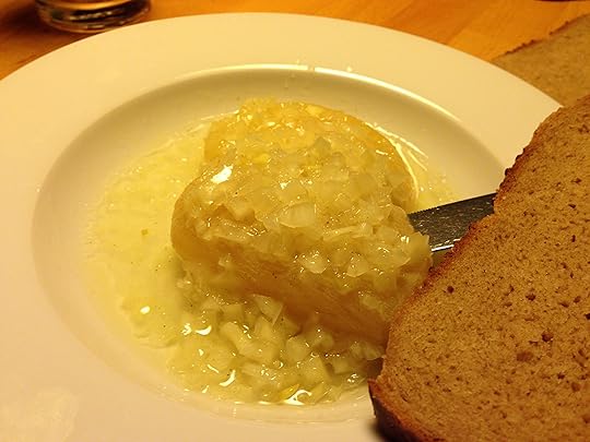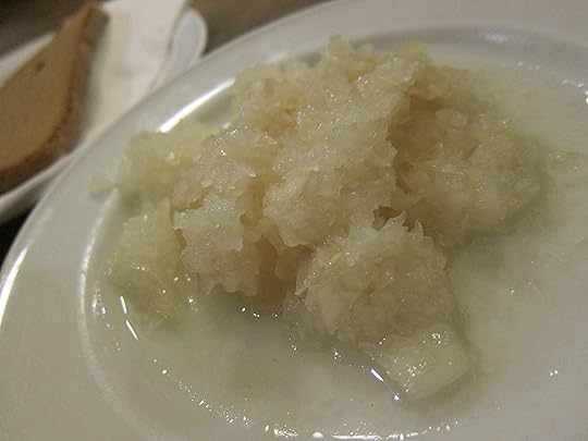 We began with a standard – Handkäse mit Musik (4,20 Euros), a spongey local cheese topped with minced onions marinated in vinegar.