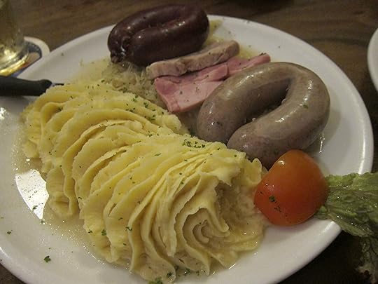 The bacon was just the first sign of a terrific meal ahead. What was on the menu? Kasseler mit puree und kraut — smoked cured pork neck with sweet buttery mashed potatoes and bacon-inflected sauerkraut …
