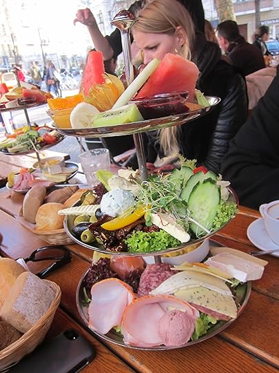 The menu is hefty, filled with omelets, crepes, sandwiches and more. But judging from the tables all around us, the set brunch (17,50 Euros for two people) — served in three-tiered towers overflowing with meats, cheeses, fruit, spreads, salad, eggs and smoked fish, is the way to go.