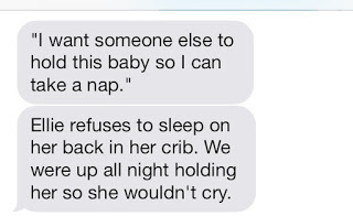 Son: We want someone to hold this baby because she won't stop crying and we've been holding her all night. We need sleep. And what's for dinner?