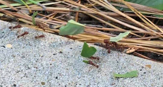 I took a photo of them while walking my granddaughter home from school. They are busy carrying leaves that are much larger than themselves.