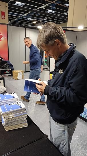 [Nella foto, io che prendo per la prima in volta in mano il libro, e l’editore divertito alle mie spalle.]