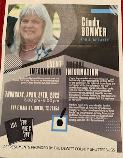 I will be doing my first in-person appearance on April 27 at the Cuero Municipal Library, and it has been about nine years since I have given a presentation of this kind. I'm not nervous about it but I do want it to