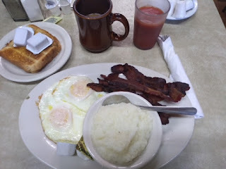 I can't even begin to describe how delicious my breakfast is: two eggs over medium, fried to perfection. Crispy around the edges. Deep dark yellow yolks. No runny white. The bacon (my god there are four slices!) are well-browned but with still just a little chewy along with the crisp, good pork flavor; smoky. The grits are creamy and full of butter. The toast is white bread done just right, with strawberry jam on the side. The tomato juice seems like it's fresh, too. I eat like I've been on a starvation diet. I leave maybe a tablespoon of grits, maybe a corner of a half-slice of toast. I drink down four cups of the medium-strong, well-roasted coffee. I am as full as a tick when I get up to pay my bill, which my waitress has silently left on the opposite corner of my table on one of her many pass-bys. Both waitresses are bustling around the place, busy busy. It's no wonder they are both willowy thin.