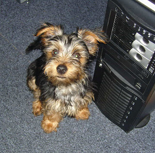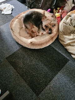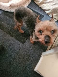 Below are four Photos of Bentley, his very first taken downstairs in the lounge and the very first one in the studio, just afterwards on his first day here with me and the last two photos that I took this morning of Bentley looking just like he did on his first time in the studio where he was standing near one of the PCs and the very last one in his basket, before making our last trip out with Margaret and me.