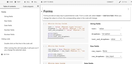 Google colab formsMore Resources on NotebooksIf you want to discover more about colab notebooks, here are a few sources: buy a copy of Pragmatic AI, explore these four colab notebooks on machine learning, watch these videos on Machine Learning, and view more content the Pragmatic AI Labs site.