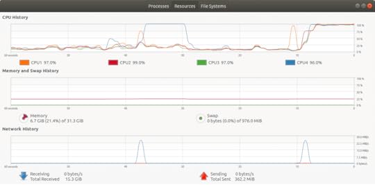 Note that the key difference between the parallel version is that it uses @numba.jit(parallel=True) and numba.prange to spawn threads for iteration. Looking at the picture below, all of the CPUs are maxed out on the machine, but when almost the exact same code is run without the parallelization, it only uses a core.