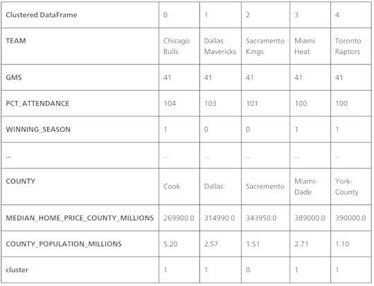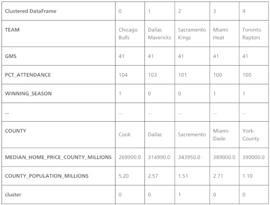 Finally, the output of the Pandas DataFrame with the cluster assignment is show below. Note, it has cluster assignment as a column now.