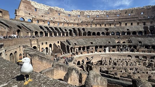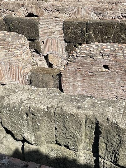 I had Amanda Claridge’s book Rome: an Oxford Archaeological Guide [2nd rev ed, 2010] with me as it is the standard work. It is best to simply photograph those pages you are likely to need each day as it weighs a lot. And so to the Colosseum. I have always been fascinated by the Colosseum because my hometown of Cirencester, the Roman Corinium, had its own amphitheatre. Ours housed 8,000 people and was about the cheapest model you could get, whereas the Roman original was the first, by far the largest and architecturally sophisticated. We used to call the one in Cirencester ‘the Humpty-dumps’.