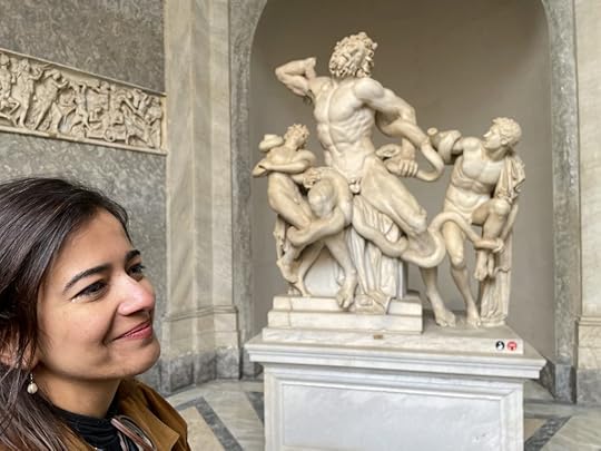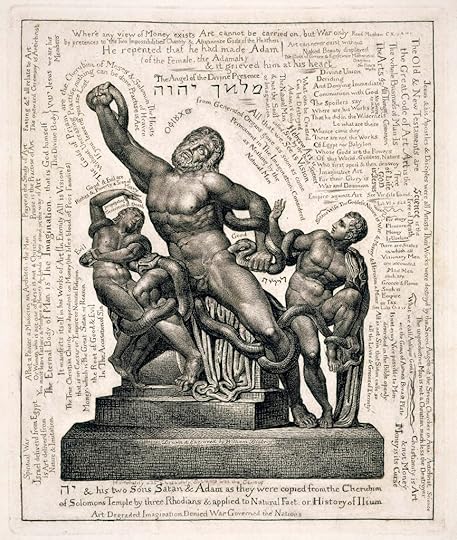 Despite having ‘jump the line’ tickets, we hung around outside the Vatican Museum for some time. But if you will go to the Vatican at Easter you are asking for trouble. It is one of the world’s greatest collections. Having recently been in Egypt I was prepared to miss the Egyptian museum which I seem to remember consists almost entirely of statues of Sekhmet, my favourite goddess, but there is much else to see. I tried to go straight to the Sistine Chapel, which is about a kilometre away from the entrance at the other end of the building, and work our way back, but the one-way crowd control system somehow subverted this and we were straight away in Bramante’s Octagonal courtyard, face to face with the Laocöon statue group. (C1 BC). Laocöon was the priest of Apollo at Troy and the work depicts he and his two sons being strangled by two snakes. It’s a vigorous piece of work. We had a facsimile of it in my art college in the early sixties, as did most other art colleges. It was first dug up in 1506 and at one point Michelangelo was thought to have made it and faked a Roman attribution. It was well known in London from copies in the eighteenth century and William Blake did several engravings of it. Camila, who is a Blake specialist, burst into tears upon seeing the real thing for the first time. Here’s Blake’s engraving and his complex commentary.