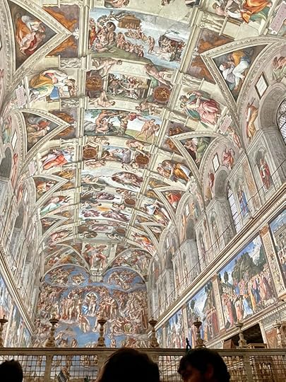 From Raphael it is still quite a treck before you emerge, accompanied by a thousand others, into the Sistine Chapel where attendants keep the line moving, shoving people into the middle if they want to stop and look. Smart phones raised they march dutifully on. In fact, photography is not allowed so there is much remonstration. Here’s one I took back in March 2023. We found seats by the side and looked up until our necks hurt. We were very lucky because Michelangelo’s The Last Judgement, (1536-1541) the fresco that covers the whole altar wall of the chapel, had been covered for restoration until presumably only a day or two before we got there. They had hoped to finish before Easter and did so, just. It had been coated in a white film, caused by the breath of so many visitors. New ventilation has apparently been installed.
