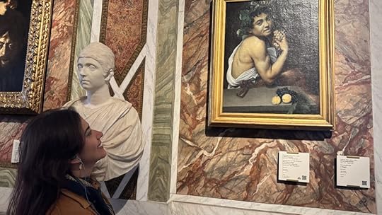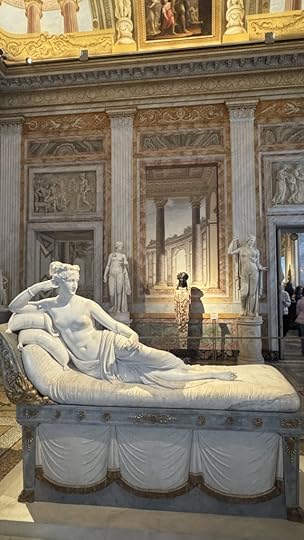 The collection includes Raphael’s Sacred and Profane Love, which I was able to sit and appreciate alone while the tour group were clustered around a writhing figure at the other end of the room. The greatest treasures for me are their six Caravaggios and his Young, Sick Bacchus (1593) in particular which is also an early self-portrait. Naturally the guide was also very keen on Canova’s Venus Victrix, (1805) a portrait of Pauline Bonaparte (sister of the emperor) commissioned by her husband Camillo Borghese. It was unusual for an aristocrat to be portrayed naked, but Canova also did a naked statue of Nappy that is now in Apsley House on Hyde Park Corner so it balances out.