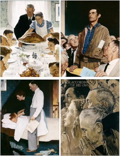 Rockwell produced these four illustrations depicting these freedoms: (beginning upper left, Freedom from Want, Freedom of Speech, Freedom from Fear, and Freedom of Worship.