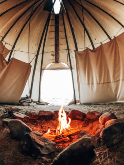A tipi interior typically featured a small, centrally located fire pit in the middle of the tipi for central heat and cooking. The fire was directly under the smoke flap at the top of the tipi. The conical formation of the tipi, with the smoke hole at the top allow the smoke to rise and escape through the opening while providing warmth and light within the space with careful attention to ventilation to manage smoke buildup.