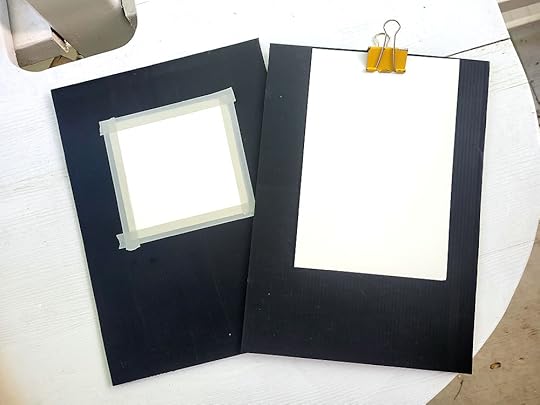 This shows a couple methods for attaching paper. Mostly I use clips but it’s sometimes nice to have the border frame resulting from taping off the paper. For me, the size of the Coroplast is important. The width is the widest thing I can put in my bag and the length needs to be long enough that I can push the bottom of it into my belly while holding it from the top with one hand.