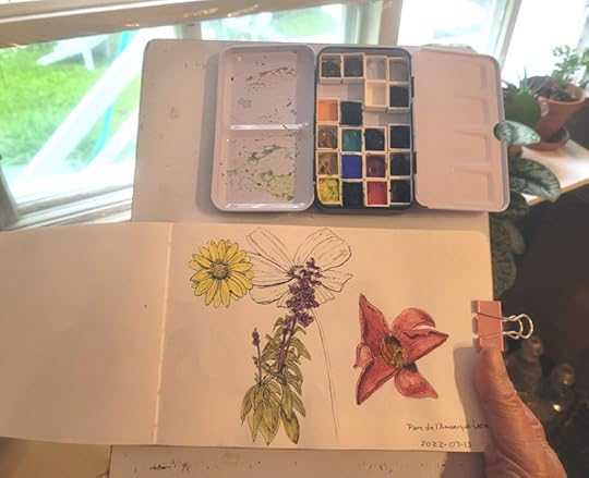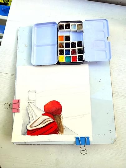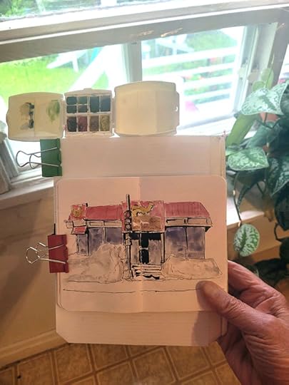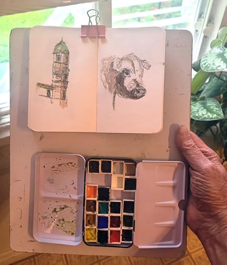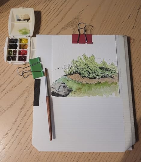 I’m starting to think about using watercolors in the field again. But the whole setup part is what stalls me… I like sketching while standing, and having to attach the palette, etc. to my sketchbook or to a board crimps my style.