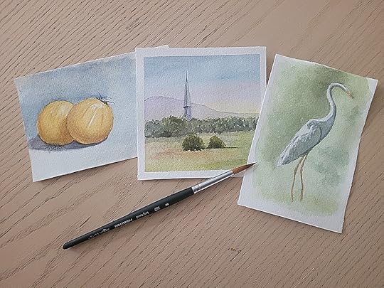 Anyway, I’ve actually done seven of these little paintings, one for each day so far. Four of them are too much of a mess to show you. Marc said in a recent post that 2 out of 10 is pretty good. I suppose he’s right. Here are three of my seven. I hope I get better.