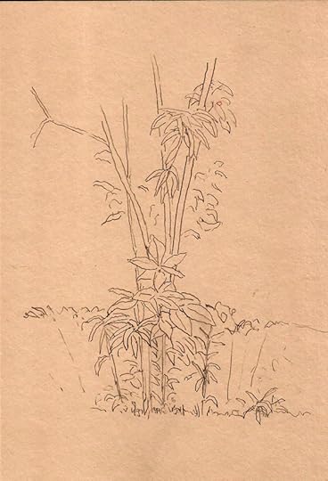 In this case I sat on a bench and looked across the path that got me there at a wall of foliage. No real “scene” existed but for my purposes that didn’t matter. I started with the lower cluster of leaves. I draw each leaf to reflect its size, shape and location, doing so as accurately as possible. After I got a bunch of those leaves drawn I chose another group of leaves (the ones higher up in the sketch and started doing the same. Emphasis was still on accuracy but also an attempt to locate that cluster relative to the first cluster. The straight tree “trunks” were my way of connecting the two clusters while looking at how well I’d done in getting everything in its place. The rest of the foliage was mostly scribbles to fill out the sketch a bit.