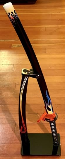 If I had it to do over again, I’d sand the saya down to bare wood, primer it white, and fade the ends (I have an airbrush now). Then I’d mark out the flames with fineline tape, mask them, and paint the saya black. Remove the tape, pinstripe the flames, and clearcoat the whole thing. Soooo much less work.