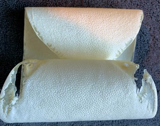 Finally (yep, four big mistakes here): I used decent kitchen shears to cut the rayskin. Yeah, no. Don’t do that. This stuff is amazingly tough and abrasive, and  I ruined the shears. Tin snips next time! Also: Probably best not to ever fight a stingray.