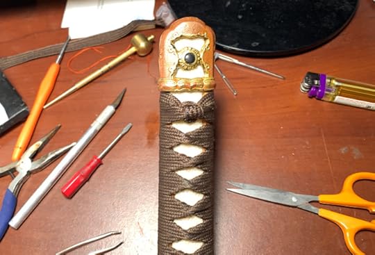 I did the tsuka-maki at my very customized craft desk. Since this was one of my first attempts, I wasn’t about to use $150 worth of silk wrapping. Instead I used a $10 synthetic ito from eBay. Despite my customizing, this is still a cheap, thrashed sword. I was kinda lipsticking a pig here, and I was new at it, so $150 lipstick seemed a bit much.