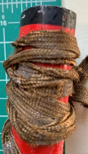 My instructor wanted a silk ito wrap, but we’d held off ordering until we’d settled on a color scheme. With the copper-on-black and the antiqued samegawa, I suggested a champagne colored silk ito from Ryujin (UK). (He’s since closed down his shop.)