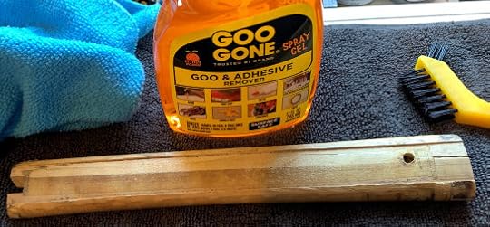 Most of the wood was tacky from adhesives. I think they’d not only glued down the samegawa, but sprayed something like Super 77 to make the cheap shoelace ito stick. I used lots of Goof Off and a wire brush to get back to bare wood: