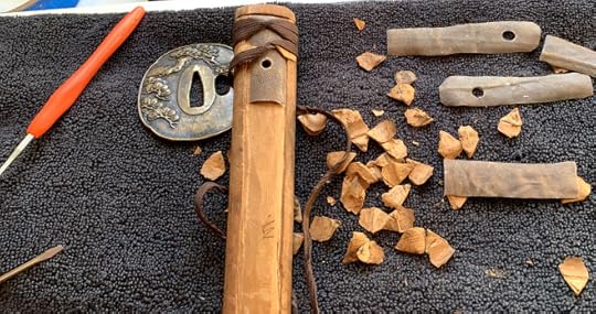 I didn’t document the saya restoration, but it was mostly just a repaint. It was rattan-wrapped, thick with old scarred brown paint. I stripped off the paint and scrubbed it clean with stiff brushes. I’d never worked with rattan and didn’t want to sand it.