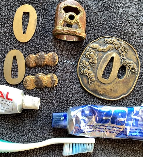Cleaning time! I removed the patina from the tsuba & fittings with Brasso and several brushes, then polished with Metal Glo and Peek: