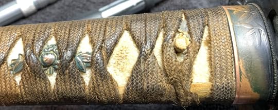 The gunto was my second ito wrap, and my first effort with the little paper hishigame wedges. I simply couldn’t figure out how to make them work. Some of it was me not having good tools; most of it was me not having good skills. All my attempts using hishigame ended up looking worse than without them.
