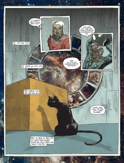 I enjoy taking scientific concepts and seeing what can happen if you stretch them and twist them around a bit. This comic was inspired by a few different sources, such as Sven Linqvist‘s Utrota Varenda Jävel (Exterminate All the Brutes) and Ursula K LeGuin‘s The Word for World is Forest. Both books deal with subjects of racism, colonialism and genocide. That felt like a logical backdrop for this story of space colonisation. And of course there’s my complete bastardization of the Schrödinger’s cat parable and the related theories of probability/uncertainty.