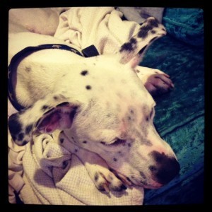 Of course I went back to Sean Casey in Brooklyn which is where I found Leon. There we found a beautiful one year old baby girl. She looks like a mix of pit bull and Dalmatian, maybe with a bit of small terrier in her. She’s a muscular little thing and incredibly strong, all white with pale spots and more pronounced black spots on her