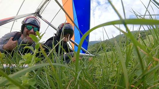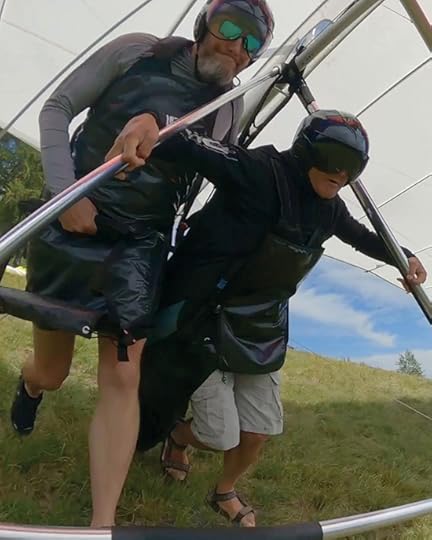 Don’t you accept Crystal’s public reporting that she “survived” paragliding. While the takeoff got her heart rate going for a few seconds, she enjoyed the whole rest of the flight. Unfortunately, the camera her pilot held didn’t capture her face for most of the flight. But when I eventually joined her on the ground, she told me she liked it and would do it again. So, please do give her all of the adventure points; but don’t let her fool you about how scared she was.