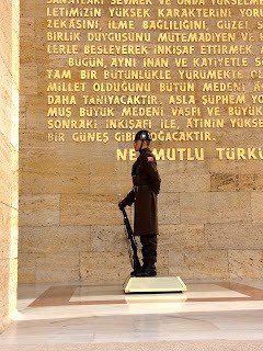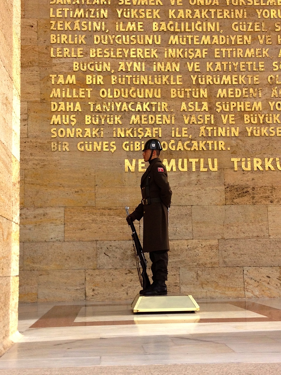 photo credit: Josh NeufeldIt was a weekday morning, still early, and when the busload of foreign journalists arrived, Ceremonial Plaza at the mausoleum of Mustafa Kemal (Atat��rk) in Ankara was mostly empty, save for a sprinkling of tourists and a gaggle of schoolchildren on a patriotic field trip. The emptiness made the bombastic architecture feel slightly forlorn.Guards in polished helmets and long topcoats with shiny brass buttons stood sentry on pedestals, still as toy soldiers, one gloved hand propped on a rifle, the other tucked neatly into the small of the back. The foreign journalists snapped photographs of them. Overhead the flag of Turkey made a red motion in the overcast sky.
