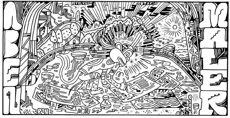 I've been continuously self publishing, and mailing people my xeroxed comics and zines since the early 1990's. I've also published a number of Graphic Novels THE WEAVER FESTIVAL PHENOMENON is the newest, self published in 2018. THE CARTOON UTOPIA and WHAT PARSIFAL SAW are available from Fantagraphics Books. SKIBBER BEE~BYE, AGAINST PAIN, and THE AWAKE FIELD are in print from Drawn and Quarterly.
