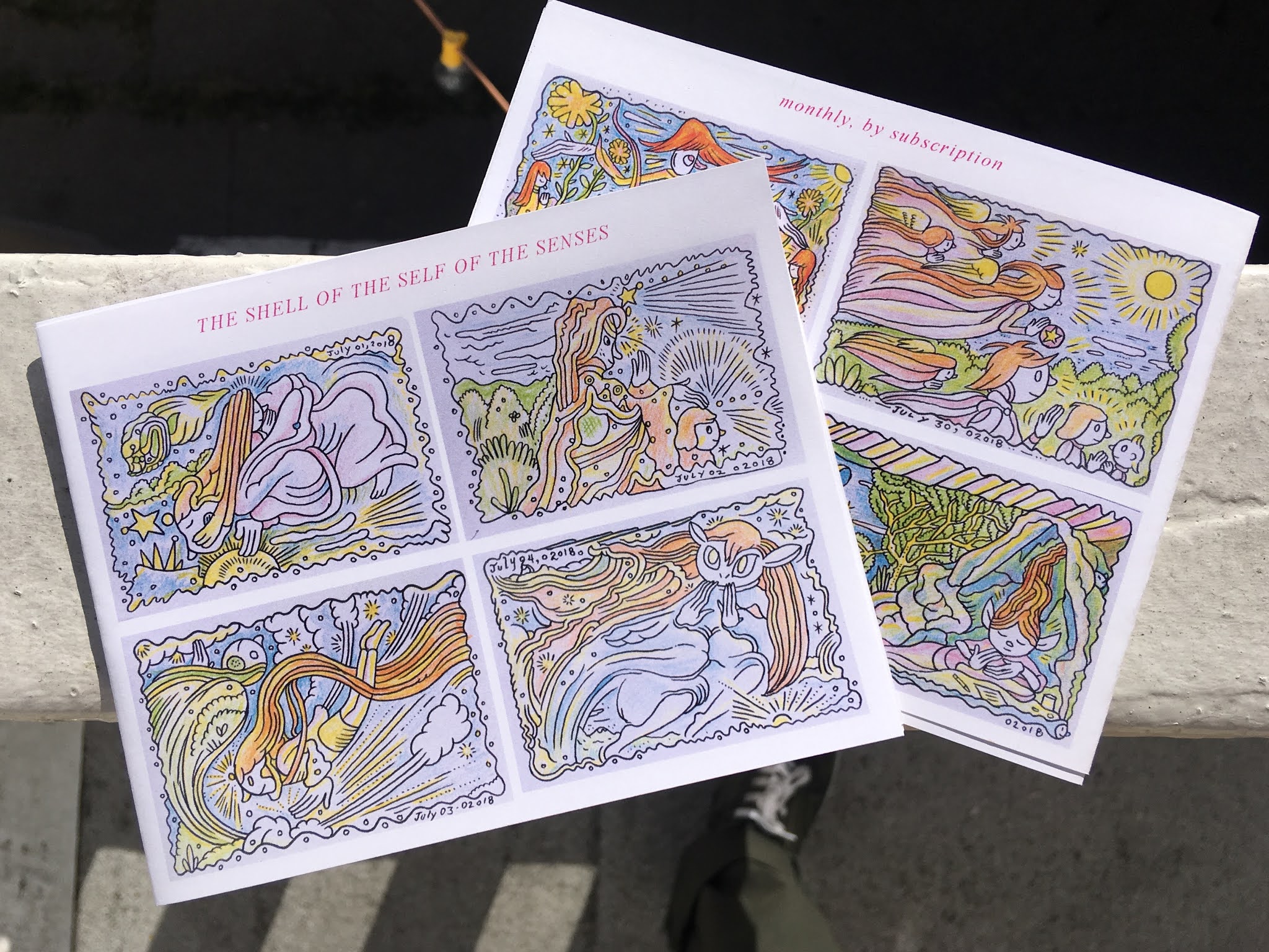THE SHELL OF THE SELF OF THE SENSES is my monthly zine subscription series. For $12/month ($15/intl) you’ll receive a new minicomic IN THE MAIL from me every month.