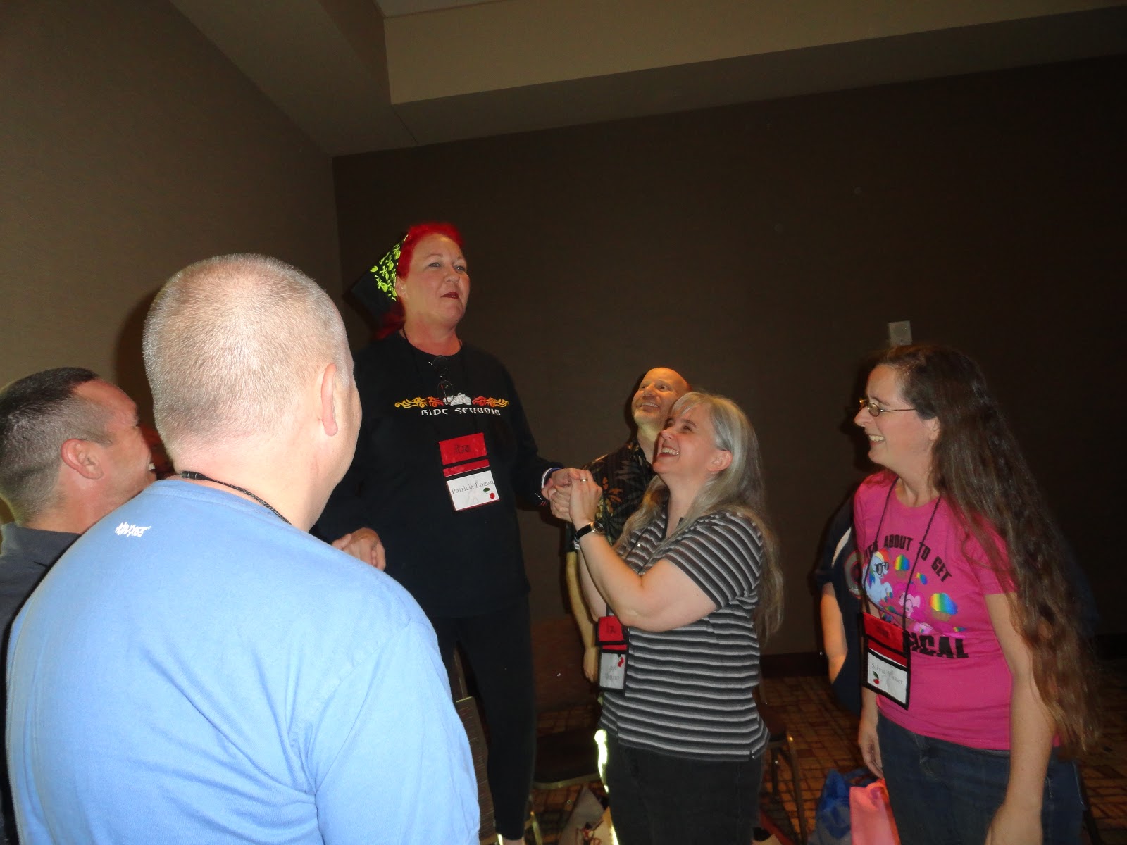 There is the pretty young man who ended up in my lap, currently in Patti's and getting some attention from JR. I do believe Karen had some nice (if embarrassing) attention from him as well *wink*Me and two of my roomies, Patti and Nanette