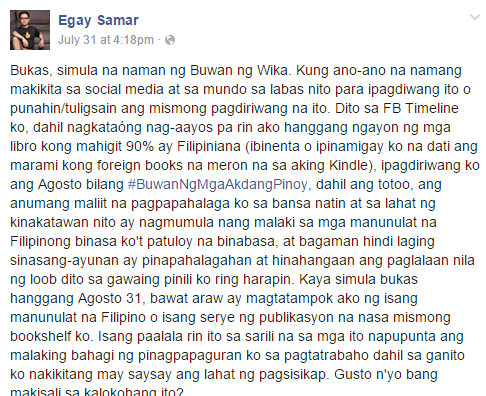 In parallel to August being Buwan ng Wika, Egay Calabia Samar – author of the Janus Silang YA series — has decided to celebrate the month as ?#?BuwanNgMgaAkdangPinoy and has invited others to join in on social media. Every day, readers are posting images of Filipino-authored books (whether written in Filipino or not) on Twitter and Facebook, and you can find them by searching the hashtag. If you’re a fan of Filipino authors or books, feel free to join in!