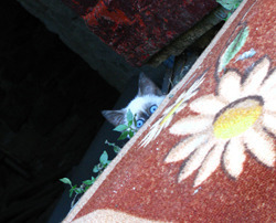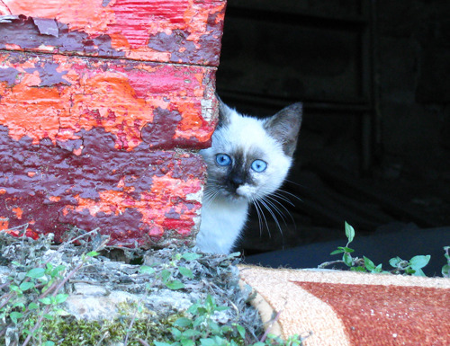 After feeding her outside for a couple of weeks, we had a breakthrough. We came home from the market early one afternoon and saw the kitten on the other side of the house near the old Cantina. I got out of the car and tried to sneak up on her. She raced away and into the Cantina. This was better because I could bring her food and work on getting her used to me. She couldn't hide so well in there.
