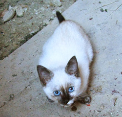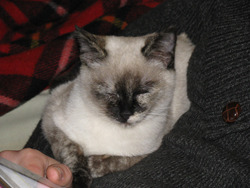 We've discovered that Cianna is an Applehead Siamese (which refers to the traditional shape of her head). I've never had a Siamese and have discovered through the Internet just what an amazing breed they are. Cianna is almost like a dog in her personality. She follows me everywhere, even to the toilet. She sleeps with us every night and spends her days beside me while I write, unless she's chasing and carrying her tiny mouse around. She's one of the best cats I've ever had.
