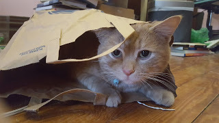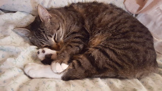 But cats are not quite as domesticated as dogs. There's always a bit of a wild side--like how their pupils get large and scary when you wave a feathery wand in front of their feline face. Then they POUNCE! Or, how you can be serenely stroking their furry belly, then they grab you and scratch and bite you, as if you deserved it.
