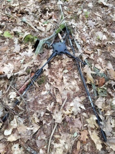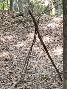 Upon entering the forest from the public dirt road, we’re greeted by a tripod of sticks. This could be caused by branches falling and landing like this—it does happen—but I suspect it was erected as a marker, because just up over that hill is The Campsite.
