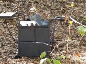 It looks like an empty patch of woods, at first… except for a ruined gas grill. It’s mostly fallen apart, but that much metal will take decades, if not centuries, to completely rot away. My first thought was to get the damned thing out of there, but it will take some lugging. It’s at least a couple of acres from the house. In the opposite direction, the public road is a a bit closer, but you have to go down a steep hill and cross a shallow ravine filled with a murky pond and poison ivy.
