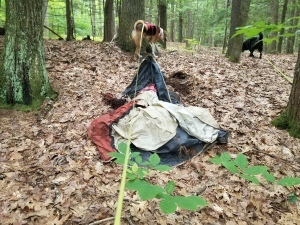 Then… I discovered this. It’s the top of a tent. Maybe it was completely buried, at one point, but over time weather eroded the soil and exposed it. Or maybe the tent just collapsed and was covered by debris. Maybe the campers left the tent set up there for a while, thinking they’d keep using it, but it eventually collapsed. Perhaps over the winter snow crushed it.