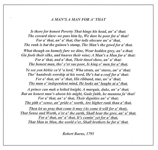 Gayle soon replied: Thanks , dear friend, for those words. You are the first one to give me feedback on my final contribution to the book. And you got the exact purpose of that Epilogue and why I originally chose Robert Burns’ poem, “A Man’s A Man For A’ That” as the book’s epigraph. You made my day!